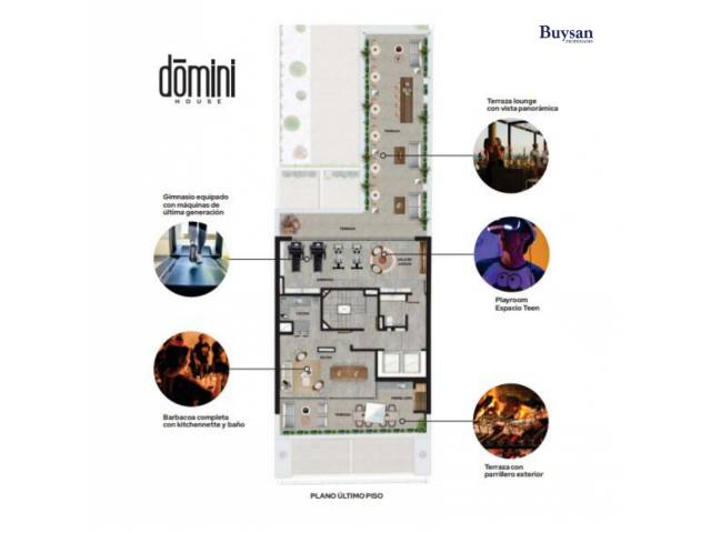 En el último piso, Domini House ofrece una experiencia única: una barbacoa totalmente equipada, gimnasio con máquinas de última generación, playroom y terraza lounge con vista panorámica a la ciudad.